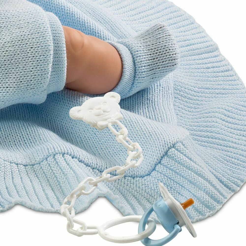 The boy was dressed in a blue outfit with a blanket fitted. His favourite pacifier is very important to him, so when we take it from him, he will cry and call mama, papa like a real baby. The doll is packed in a decorative cardboard box.